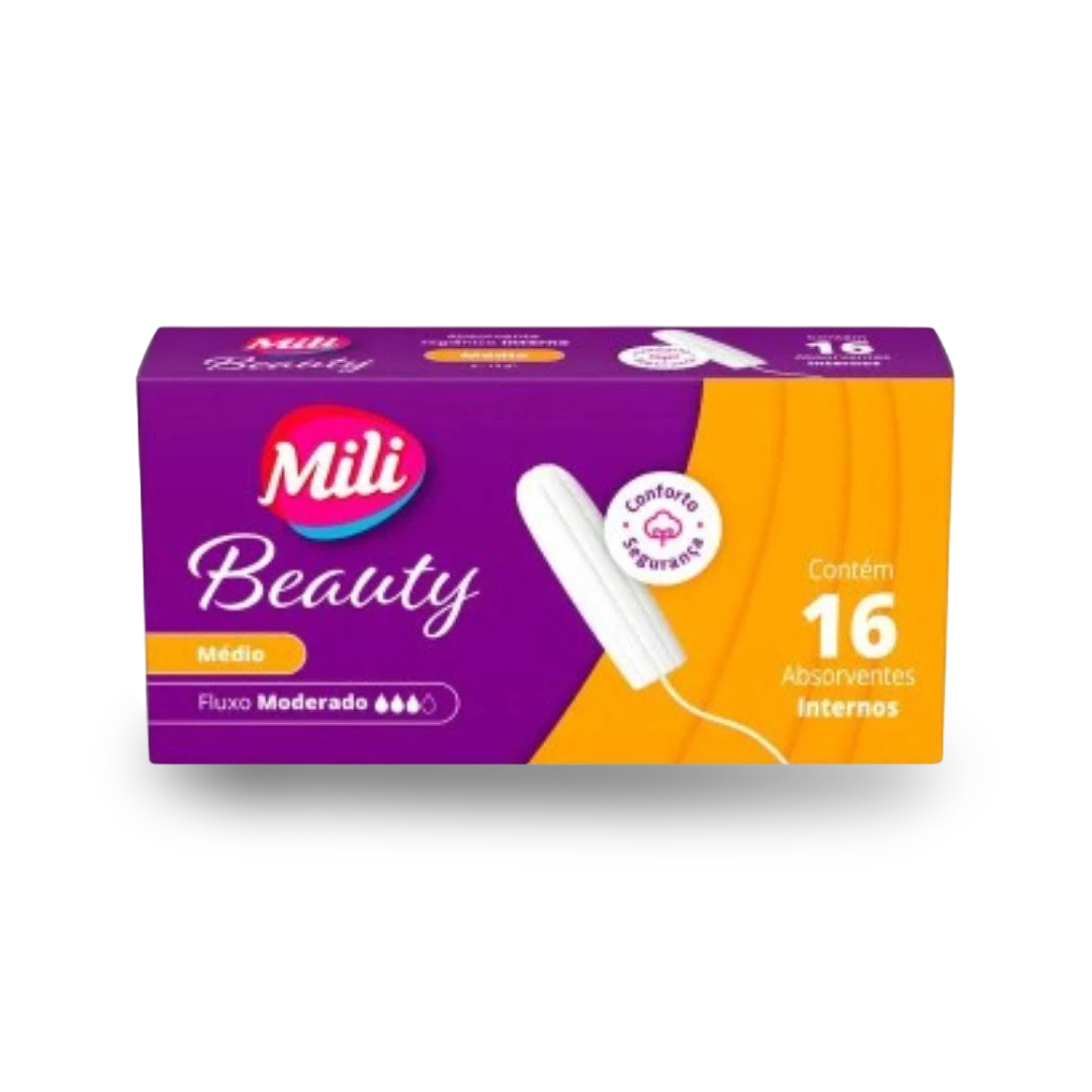 Os absorventes internos Mili Beauty são fabricados com materiais que asseguram conforto e higiene. Com tamanho médio, eles absorvem com eficiência sem causar desconforto. A embalagem contém 16 absorventes com aplicadores, focando na facilidade de uso e proteção confiável em momentos de necessidade.