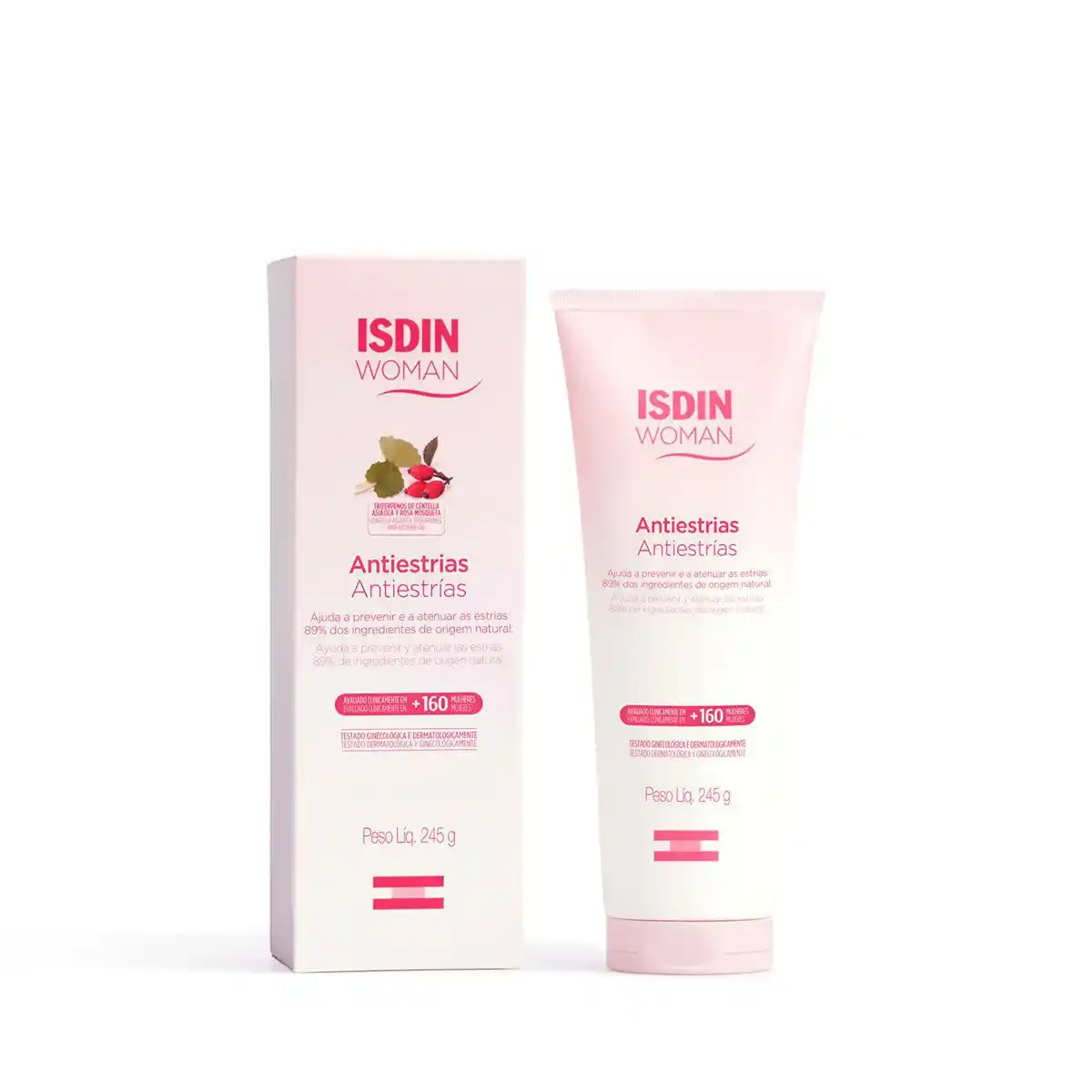 O que é: O Woman Isdin Antiestrias é um creme que ajuda a combater e atenuar as estrias que surgem no corpo da mulher, seja na puberdade, na gravidez ou por alteração de peso. Sua fórmula contém ativos naturais que ajudam a aumentar a elasticidade da pele, prevenindo contra o aparecimento de novas estrias, e a minimizar a aparência das estrias já existentes. Com textura leve e de rápida absorção, é um creme ideal para uso diário.