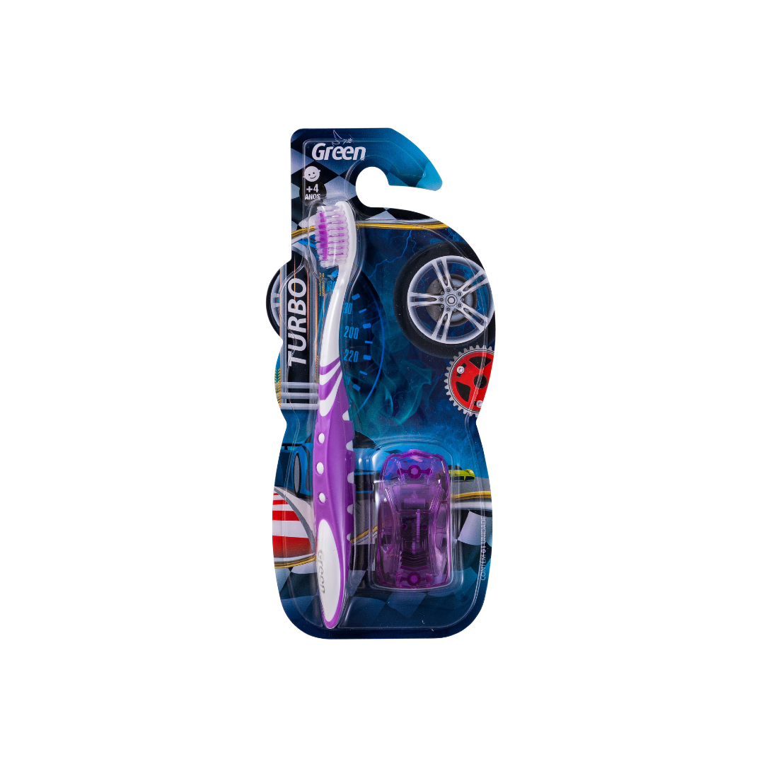 A Escova Dental Infantil Green Turbo foi desenvolvida para crianças a partir de 4 anos, unindo cuidado, eficiência e diversão. Possui cerdas macias, que garantem a limpeza adequada sem agredir as gengivas, e cabeça anatômica, que facilita o alcance de todas as áreas da boca.