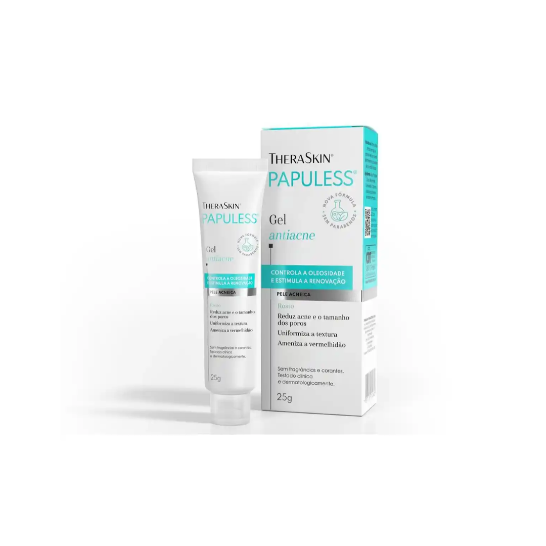 Controle eficaz da oleosidade e melhora da textura da pele com o Gel Anti Acne Theraskin Papuless, produto hipoalergênico e livre de parabenos.