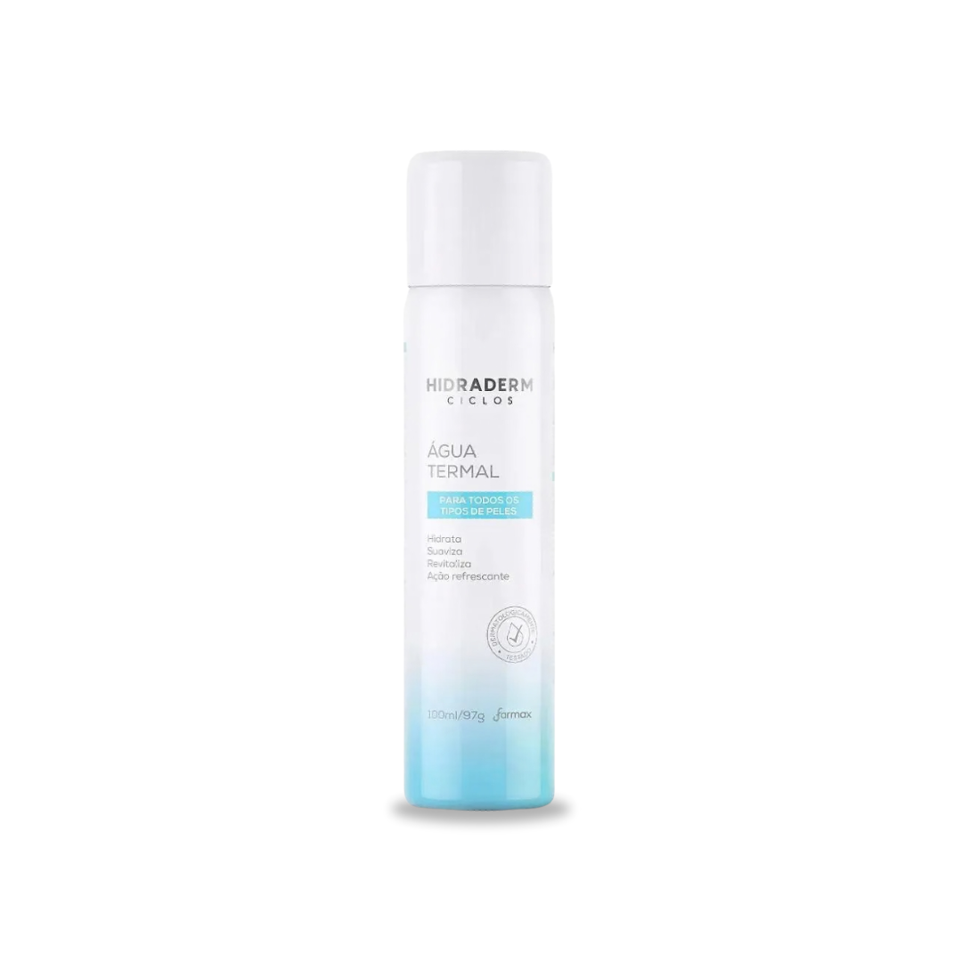 A água termal Hidradern Ciclos da Farmax vem em embalagem de 100 ml no formato aerossol, fácil de aplicar e ideal para levar em viagens ou na bolsa. É uma versão enriquecida da água comum, contendo sais minerais que beneficiam a saúde da pele no dia a dia.