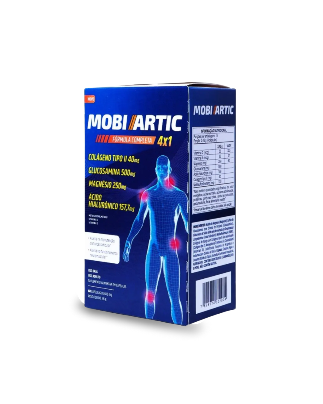 Mobiartic é um suplemento vitamínico desenvolvido para auxiliar na proteção das articulações, na redução de dores articulares e na recuperação da mobilidade. Sua fórmula atua como um tratamento contínuo, reunindo uma combinação exclusiva de Colágeno tipo II, Ácido Hialurônico, Magnésio e Glucosamina, nutrientes essenciais para a manutenção da saúde articular.